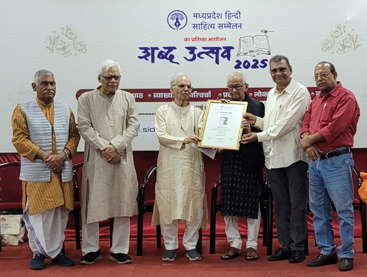 Chhindwara update: हिंदी साहित्य सम्मेलन की प्रदेश ईकाई द्वारा भोपाल में आयोजित दो दिवसीय शब्द उत्सव कार्यक्रम में छिंदवाड़ा जिले के प्रसिद्ध चित्रकार श्री ध्रुव राधिका रामचंद्र को साहित्य में समर्पित रूपांकन के क्षेत्र में उल्लेखनीय योगदान के लिये श्रीमती उर्मिला तिवारी स्मृति सप्तपर्णी सम्मान 2025से अलंकृत किया गया। मायाराम सुरजन स्मृति भवन में आयोजित कार्यक्रम में कार्यक्रम के अध्यक्ष प्रसिद्ध साहित्यकार श्री नरेश सक्सेना के साथ ही अन्य अतिथियों वरिष्ठ साहित्यकार डॉ राधावल्लभ त्रिपाठी, श्री बिष्णु नागर और श्री महेश कटारे ने यह पुरस्कार प्रदान किया। म. प्र. हिंदी साहित्य सम्मेलन छिंदवाड़ा जिला इकाई के सक्रिय सहयोग से जिले को मिली इस उपलब्धि पर जिला इकाई के अध्यक्ष सहित सभी पदाधिकारियों व सदस्यों ने चित्रकार श्री ध्रुव राधिका रामचंद्र को बधाई और शुभकामनाये दी हैं। इस अवसर पर कार्यक्रम में छिंदवाड़ा से सर्वश्री ओमप्रकाश नयन, दिनेश भट्ट, रोहित रूसिया व पंकज सोनी शामिल हुए।